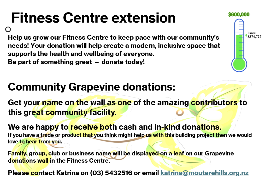 Thank you to everyone who has made the development of the Fitness Centre possible. Special mention must be made to Sarau Trust and the Greenhough and Hyatt Families for your continued support.  Also Rata Foundation, Pub Charity and IMB Construction whose financial contributions were greatly appreciated.